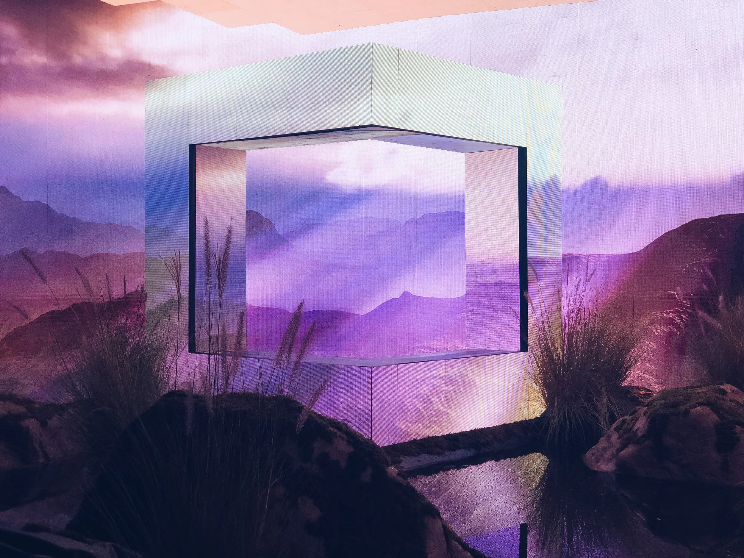 LED sculpture submerged in a shallow pool, synched w the background. Plants and rocks that create an immersive landscape.