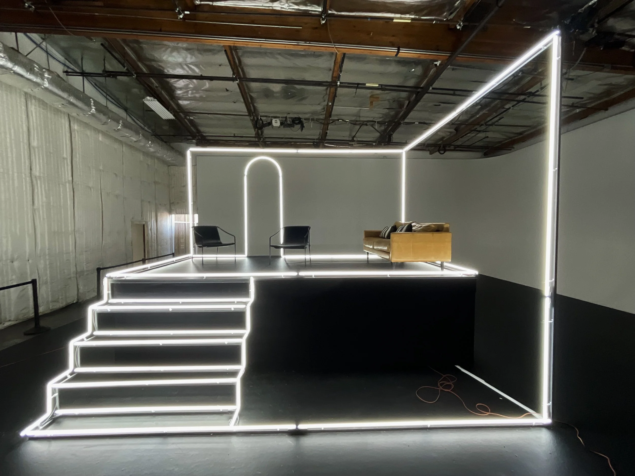 Set design for Jay Shetty podcast. Built with custom made glass neon lights over a platform.