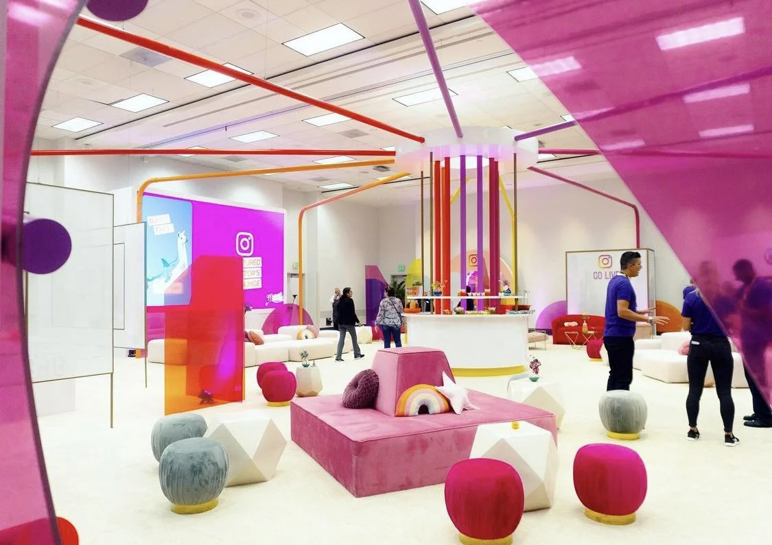 VIDCON INSTAGRAM BOOTH AND VIP AREA. The concept is based on communication, the floor booth flows, taking the visitor to different activation areas. pipes create a central area and connect to the different activations. vidcon is all about communication and connecting.