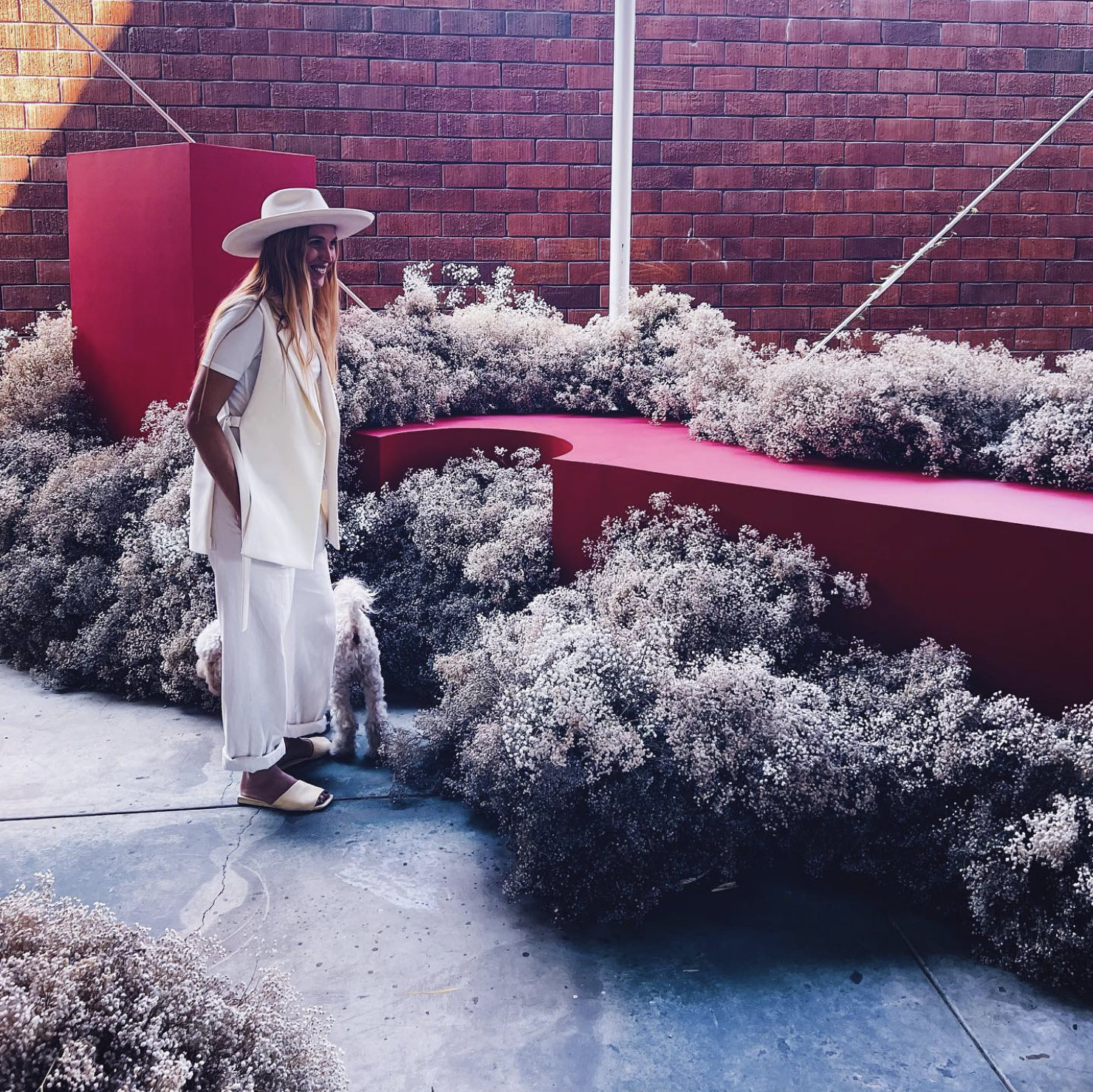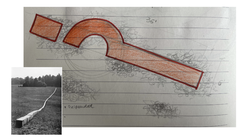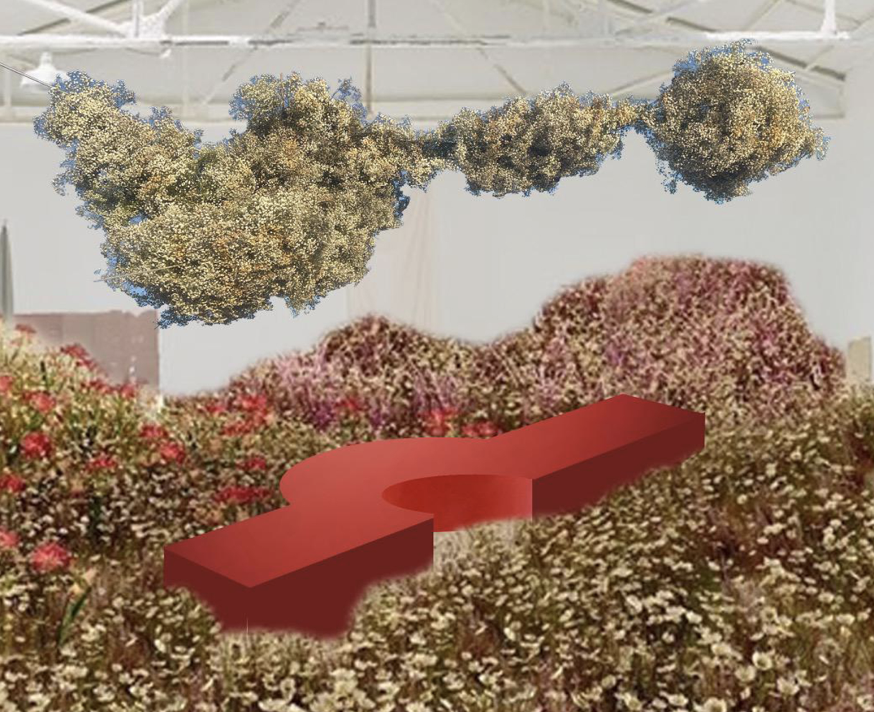 RED PATH, sculpture 20ft long made out of wood, on a warehouse surrounded by bushes of flowers.